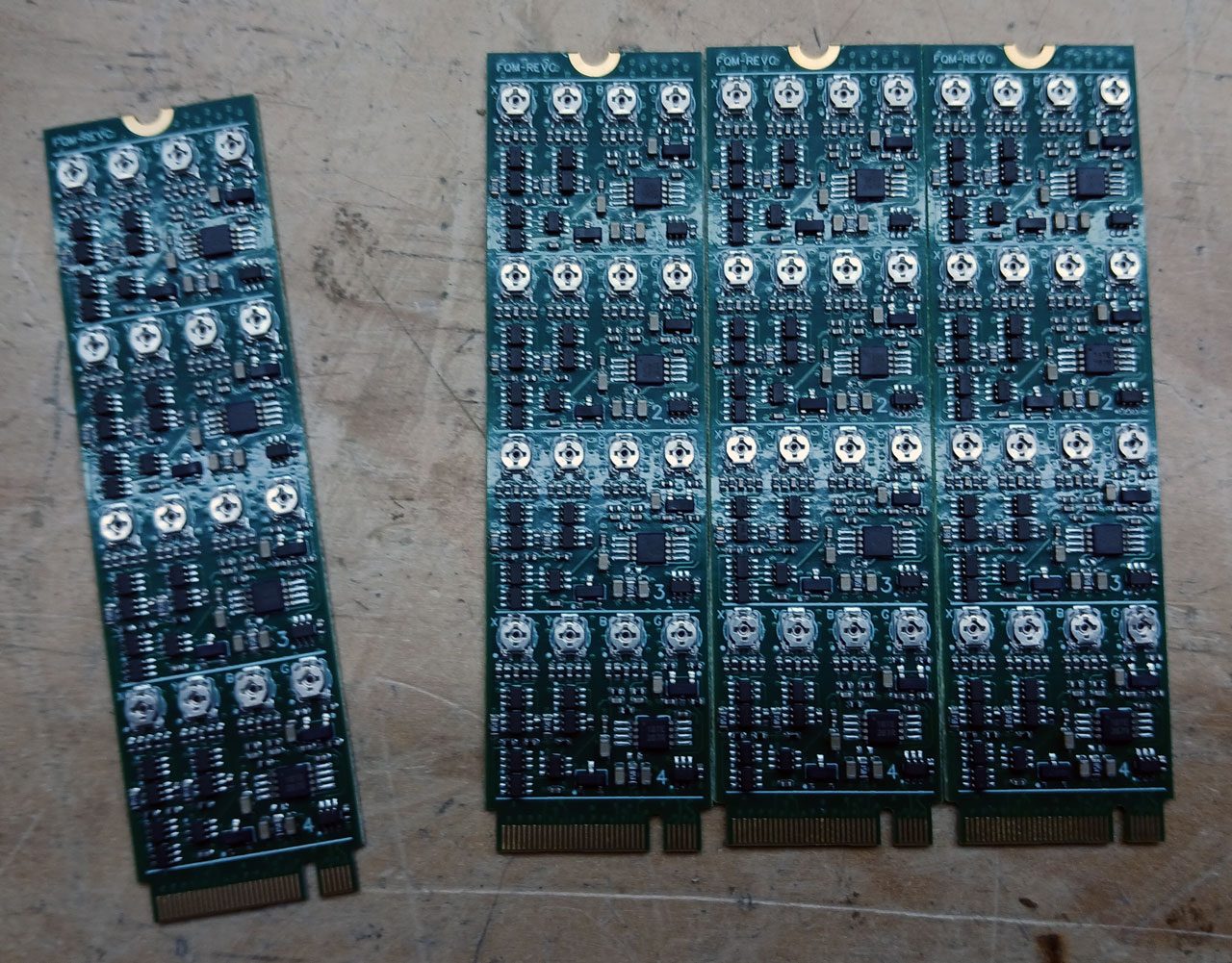 - HGA-REVA, a quad high gain clipping amp submodule. The test board is shown, but the assemblies are missing in this photo. This design provides high gain amplification of an input signal, with the integrated limiting amplifier clipping the outputs. It has a few uses, but soft key generation is the most obvious one. This is a new revision of circuits from Doorway, Staircase/Stairs, and Topogram.