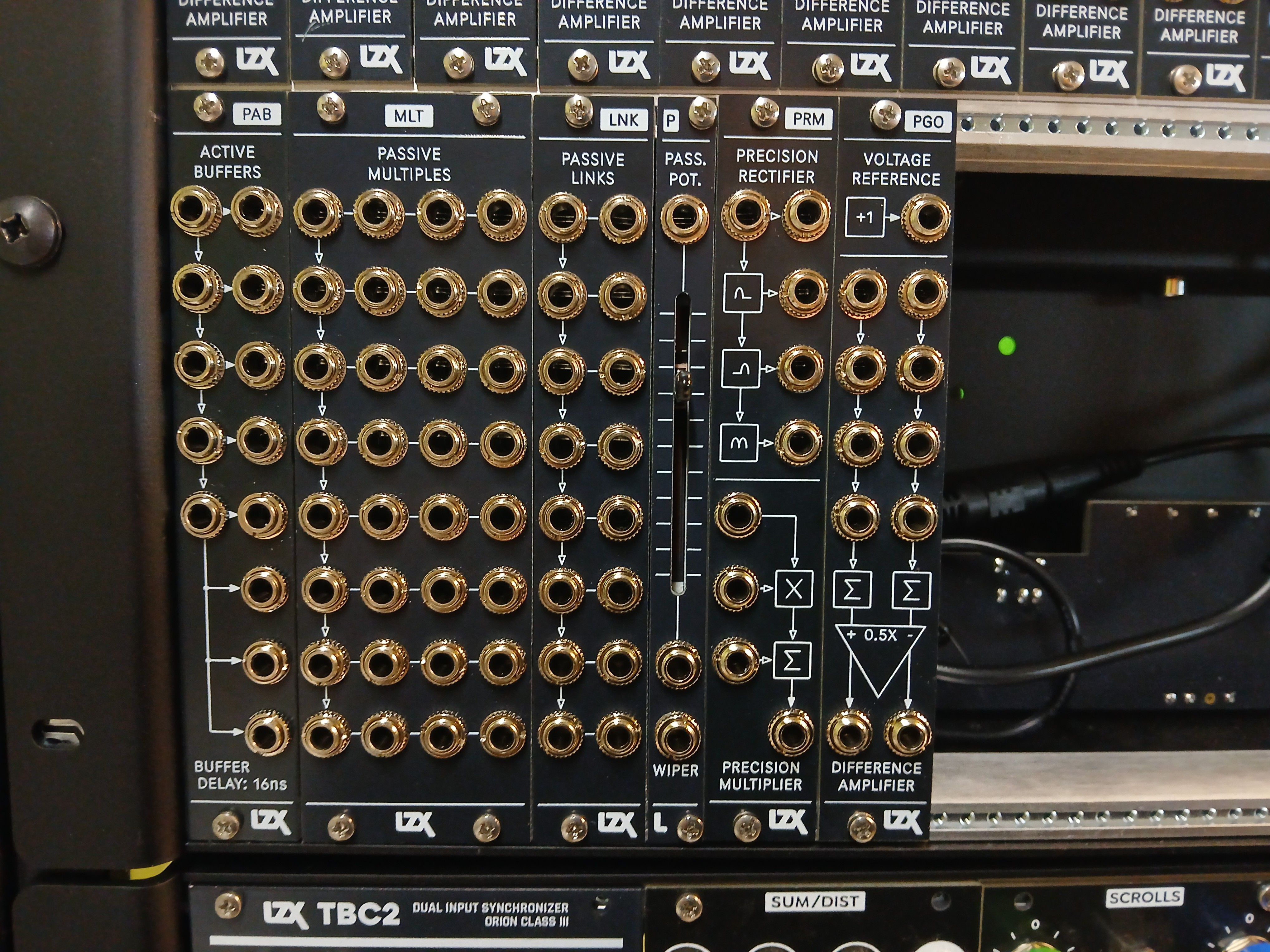 After a year's hiatus, we released our first new module in November last year: PGO. We now have five more in this series available, in what we are calling the P series: modules which fit one of the three themes: Passive, Precision or Programmable. P Series functions are not complex, exciting video effects on an individual basis: they are the building blocks of them. Those of you who wish to dig into the nuts and bolts of analog graphics will find that all the right operators are here to patch most of the functions in our other modules. As we consider revising earlier modules and developing new modules, this series provides a chance to encapsulate our best practices in video synth module design thus far, and provide a solid foundation on which to do so.