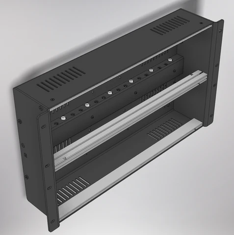 We also ordered an initial production run of 10 pcs our 6U EuroRack case with DC & sync distribution. If the fabricated pieces pass our QC, we should have these available for sale in May. I've shown some teasers of the prototype before. Here's what the production version looks like: