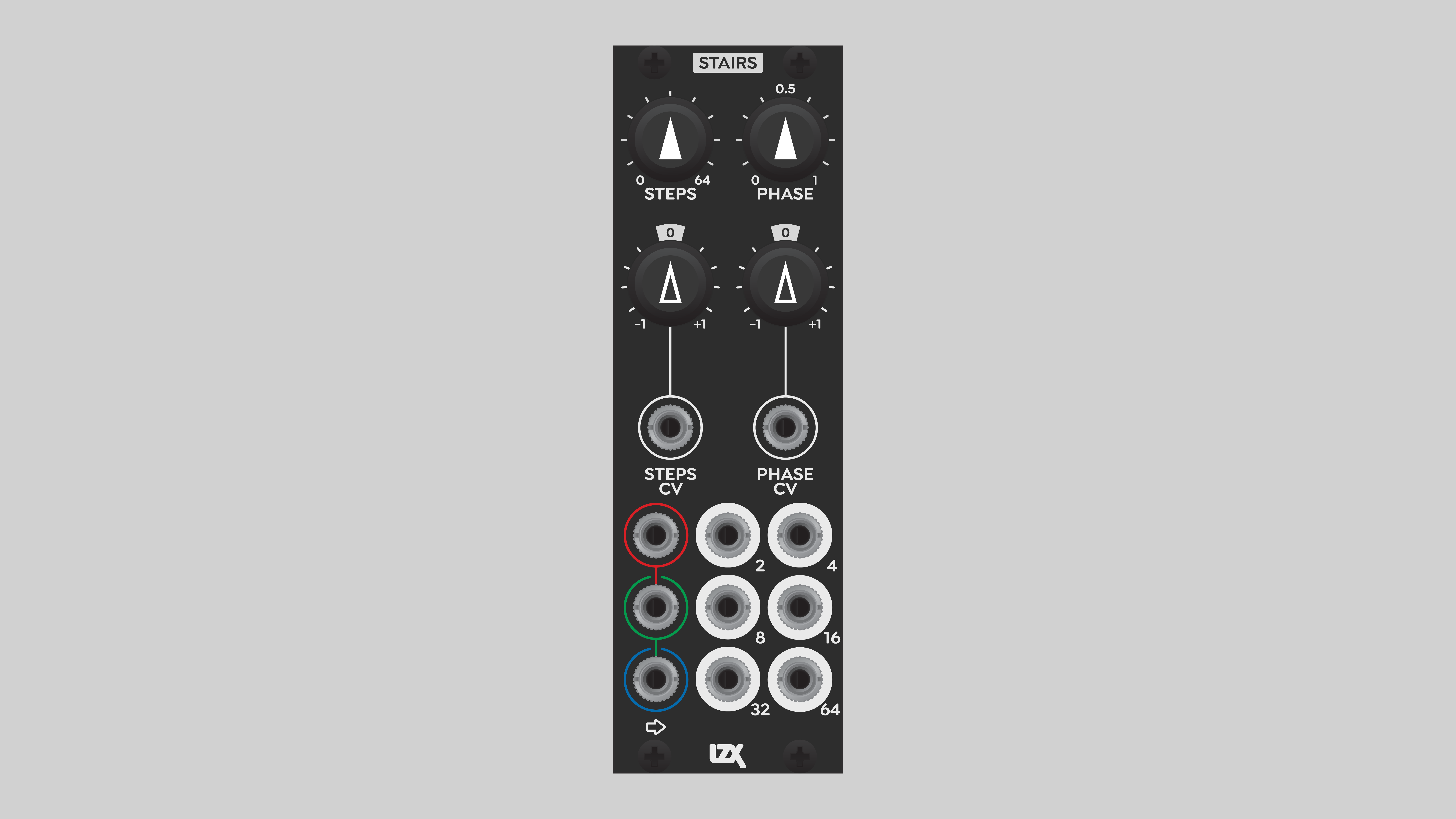 Stairs has two voltage-controlled parameters: Steps and Phase. Each can be manually adjusted by the corresponding potentiometer on the top row. Additionally, any signal may be patched into the Steps CV or Phase CV jacks in the center of the module. The gain of those incoming control voltages is adjusted with the corresponding Depth attenuverters. Counterclockwise rotation, to the left of 12 o'clock, inverts the incoming control signal.