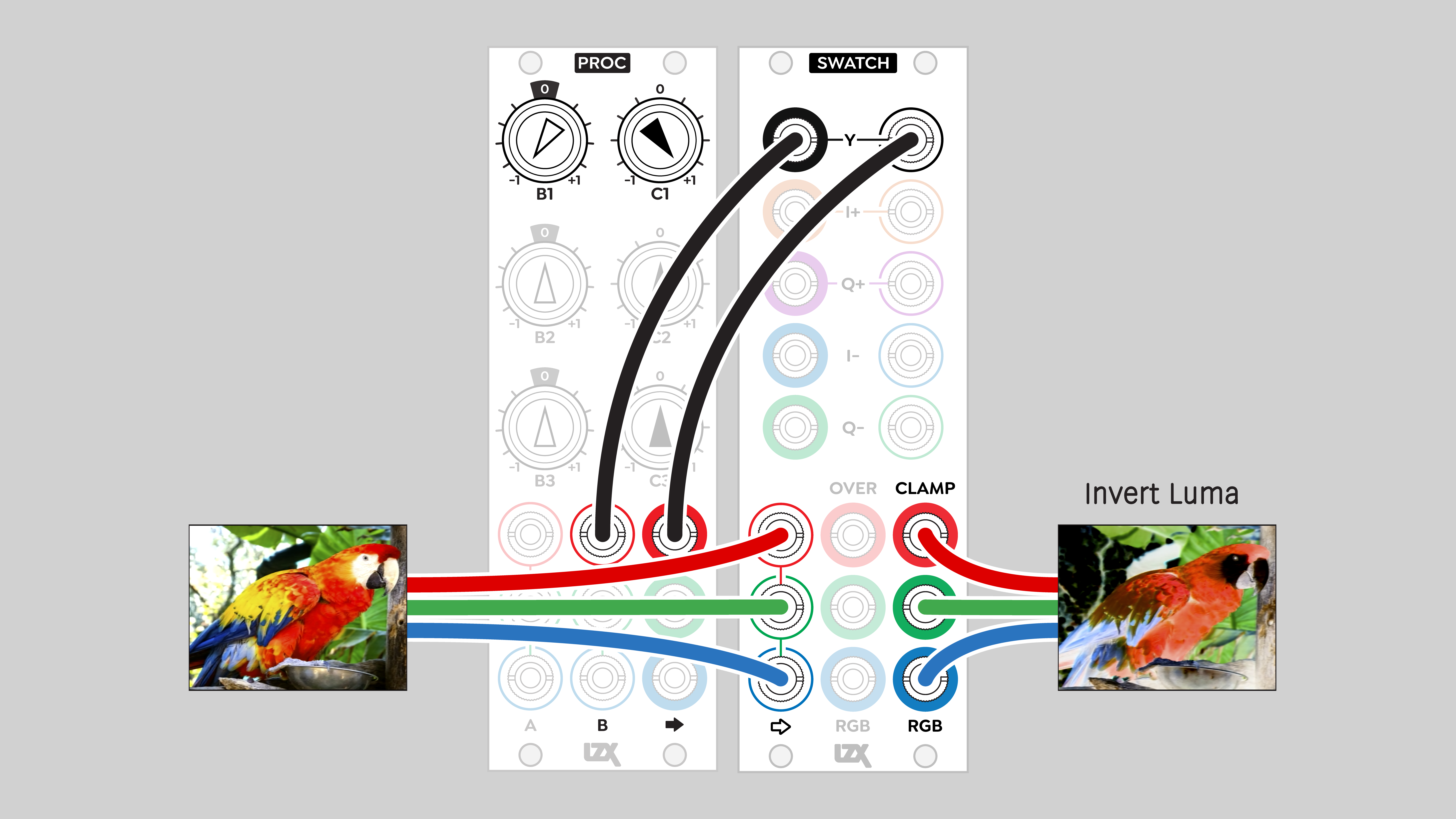 All analog color difference channels employ bipolar signals that can be positive or negative. Swatch is no exception. The I and Q inputs and outputs are all bipolar, with a range from +0.5 to -0.5. Some LZX modules can handle bipolar signals. Examples include Proc, SMX3, DSG3, PGO, and PRM. Modules designed primarily for picture signals may not support bipolar signals. For example, FKG3 will ignore negative voltages.