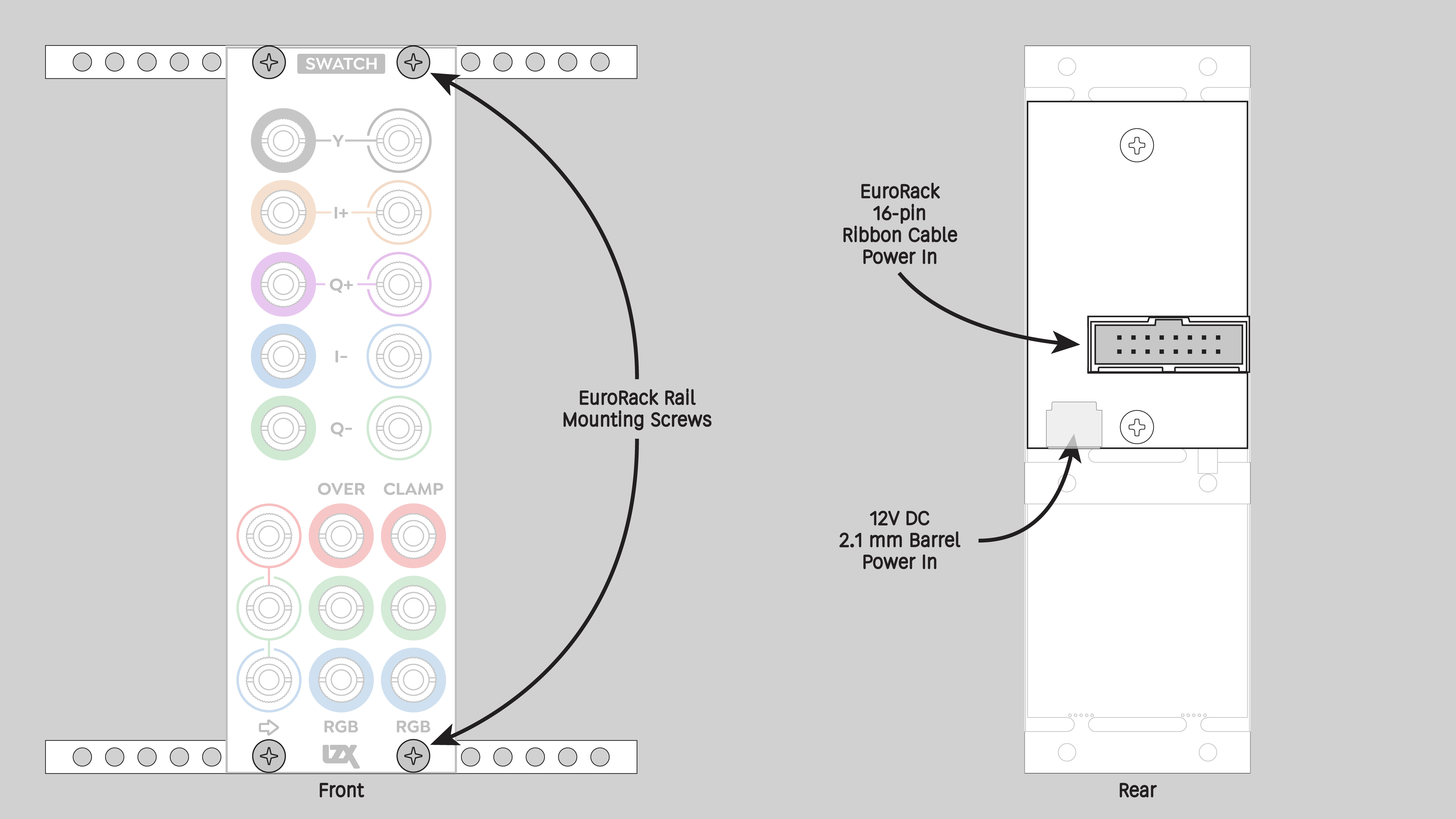 RGB inputs are converted to YIQ components and output from five jacks on the upper left. Y is luminance, and I and Q are the color difference channels, described in the Operation section below. I and Q outputs come in two flavors, positive and negative. I+ and Q+ are the color difference channels transcoded from the incoming RGB components. I- and Q- are phase inverted versions of the color difference channels. The inverted color channels provide immediate creative possibilities by merely patching Swatch to itself. Double the saturation, invert the chrominance, or mutate color in unfamiliar ways. For details, check the Example Patches section below.